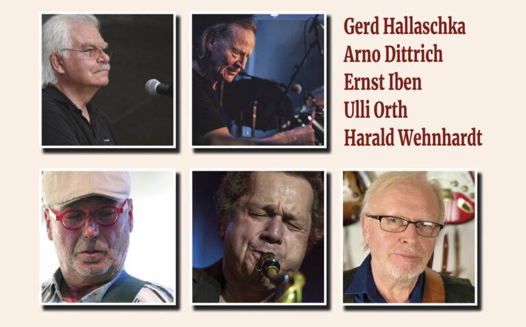 Arno Dittrich, der die Trommelstöcke führt und einige Titel singt – Gerd Hallaschka, der die Tastenfachkraft ist und sich auch gesanglich „betätigt“ – Ernst Iben – einst als Multiinstrumentalist unterwegs –, der den Bass „zupft“ – Ulli Orth, der die Töne und fulminanten Melodiebögen aus Alt- und Tenorsaxofon „zaubert“ und – Harald Wehnhardt, der virtuos die Gitarre spielt und auch als versierter Sänger agiert, der eigene Stücke komponiert und professionell arrangiert.